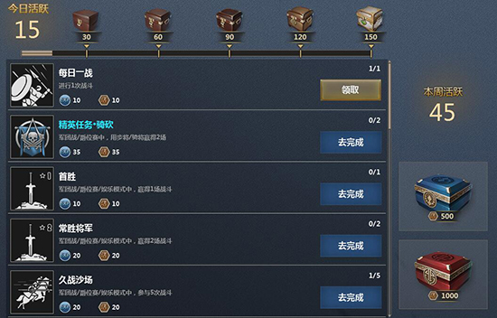 每天上线后看自己的精英任务,如果有150杀敌的任务,玩复活或者攻城是比较好的选择。精英任务是必须完成的,一般随着每天久战沙场任务(玩5局军团或者爵位或者娱乐)完成后,精英任务也完成了。在这个过程中你只需要顺手点赞,运气不太差的话首胜也是可以的,也就是5局玩下来,你一口气做完了4个每日任务。 + E1 Z/ Y. U6 x. n, G$ A